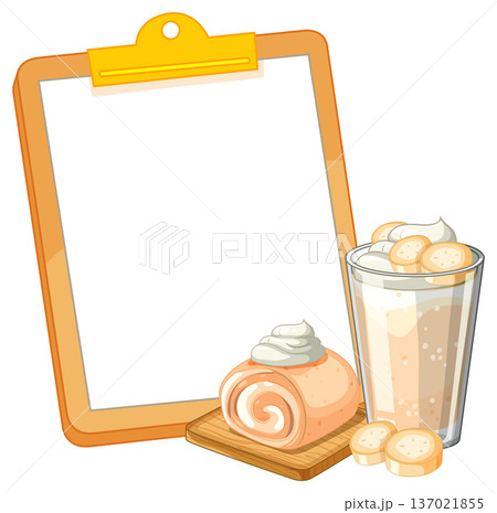 Blank Clipboard with Banana Swiss Roll and Smoothie Vector Illustration