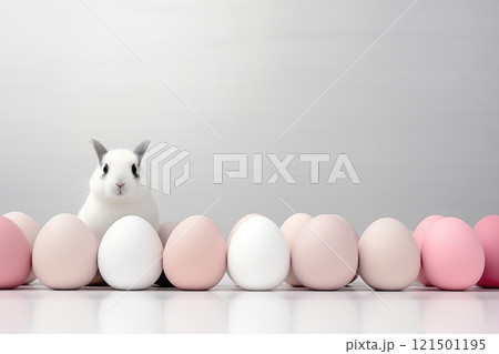 Cute Easter bunny with painted eggs and copy space background. Concept and idea of happy Easter day.