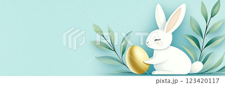 Cute white rabbit with large ears holds a golden egg surrounded by green leaves on a light blue background