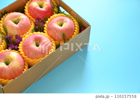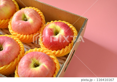 beautiful pink apple in yellow wrap bubble, healthy fruit in the box