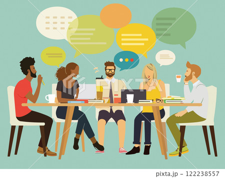 Illustration of three people working, sharing ideas, and communicating. Concept of teamwork, brainstorming, collaboration, success, and business discussion with speech bubbles and stars