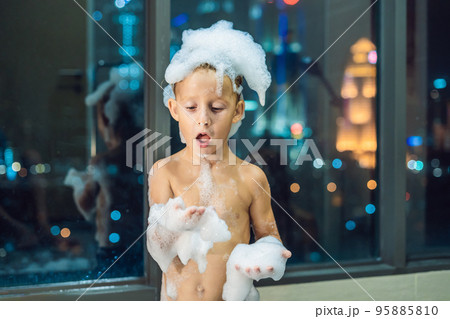 Happy little baby boy sitting in bath tub in the evening before going to sleep on the background of a window overlooking the evening city. Portrait of baby bathing in a bath full of foam near window