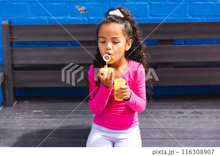 In school, young biracial girl wearing pink blowing bubbles outdoors