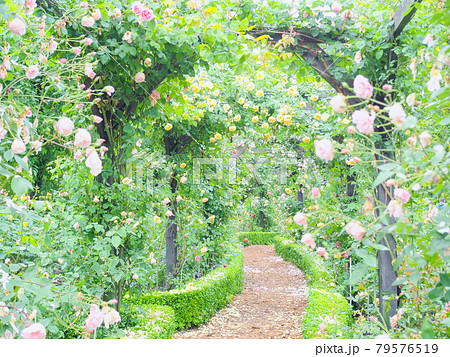 バラのアーチ アーチ ローズガーデン バラ園 石畳