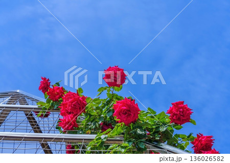 青空を背景に咲き誇る真っ赤なバラのアーチ コピースペースあり