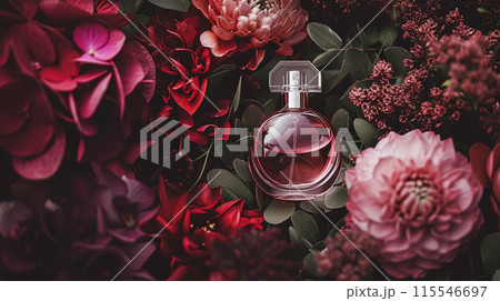 Perfume bottle with beautiful flowers. Beauty concept. Flat lay, top view