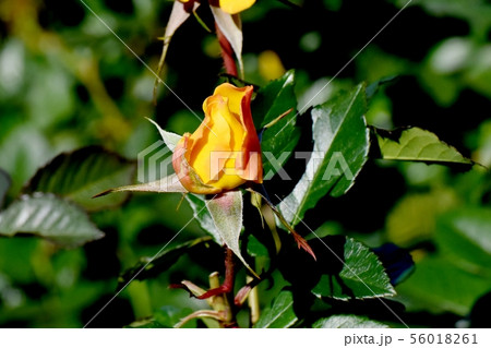 調布市の植物園に咲くオレンジと黄色のバラ ゴールドマリー(モダンローズ)