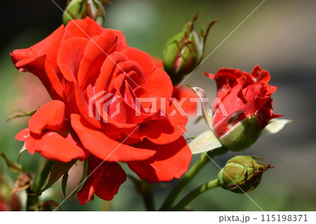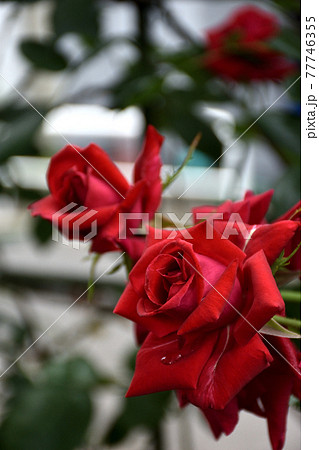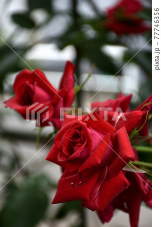 調布市深大寺元町の植物園に咲く赤いバラ(モダンローズ 花房)の花
