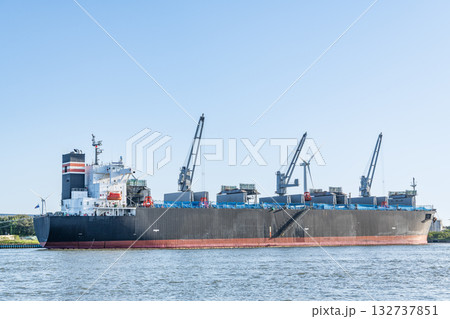 荷下ろしをする大型ばら積み貨物船