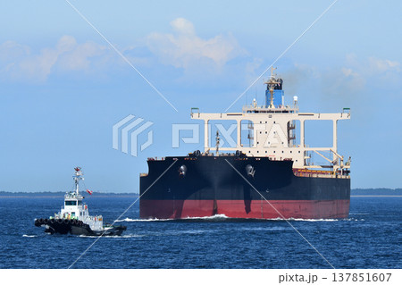 夏の海を進む大型貨物船とタグボート