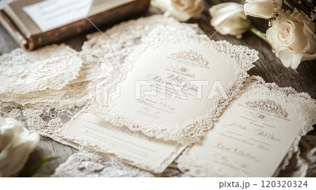 A collection of exquisite wedding invitations adorned with lace and roses, elegantly displayed on a rustic wooden surface, showcasing romantic details and intricate designs.
