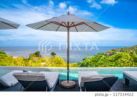 Luxury tropical resort or private villa with turquoise pool, sunbeds, umbrellas and palms. Relaxation and vacation concept