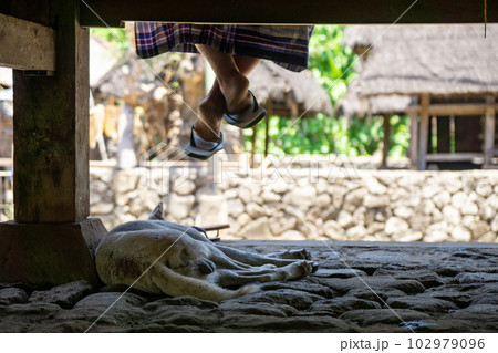 トゥガナン村の縁側に座る女性の足元と眠る野犬