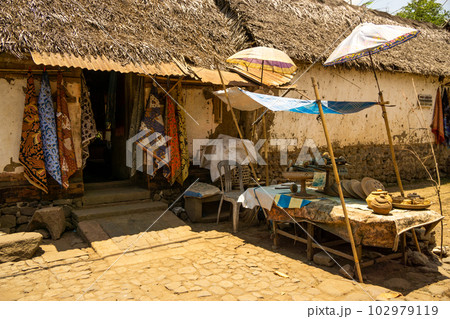トゥガナン村の伝統工芸品を並べるお土産屋さんの風景