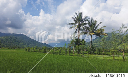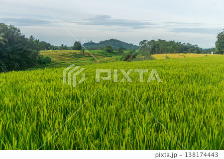 Beautiful morning view in Indonesia, panoramic landscape of rice fields with mountain ranges and clear sky