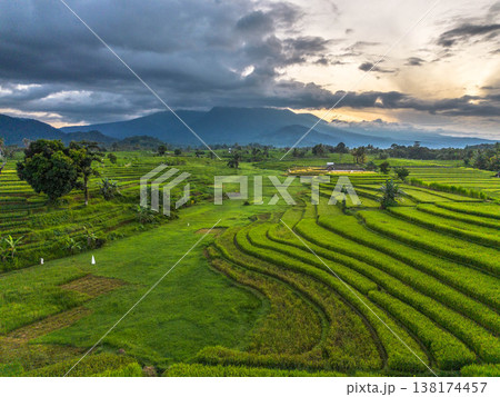 Aerial drone view beautiful rice field during sunrise, Java, Indonesia