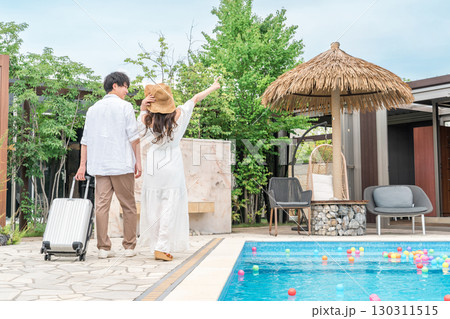 リゾートホテルのプールサイドを歩く若いアジア人カップルの男女(ハネムーン・バカンス)