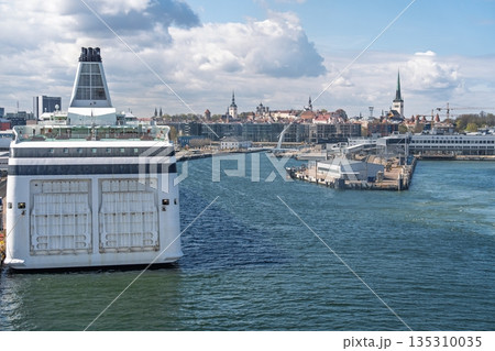 Ferry Boat Arriving in Tallinn, Estonia A Seascape View of Historic City Skyline