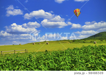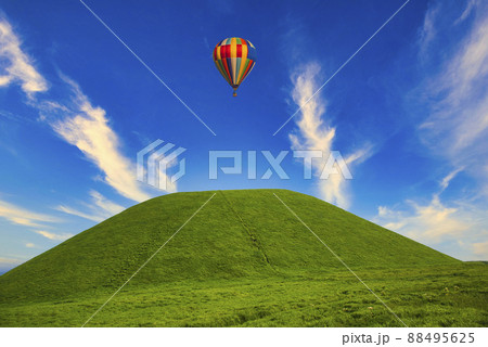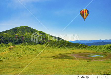 阿蘇地方の草千里浜上空を飛行するバルーン