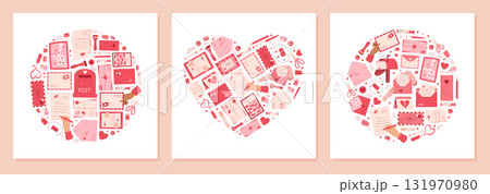 Flat style hand write love letter set, modern cute character send romantic message in envelope, cartoon craft postcard design with heart and lips, trendy romantic post card concept with kiss.