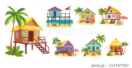 Cartoon beach houses. Shack house on beachfront, tiki bar cabin hut bungalow country building cottage in caribbean or australia island