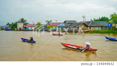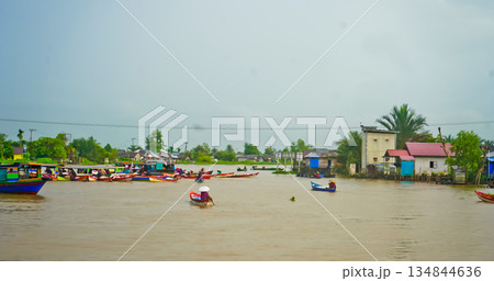 Beautiful view of Mertapura River floating market, South Kalimantan, Indonesia