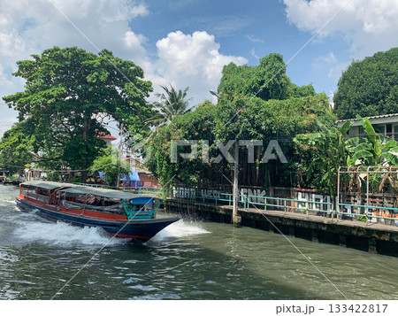 タイ・バンコク チャオプラヤ川クルーズで見る川上の古びた住宅 水上家屋とショップなのどの店と水しぶき