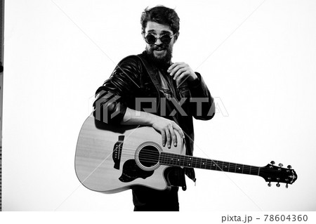 A man with a guitar in his hands leather jacket music performance rock star modern style dark background
