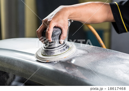 車のバンパーにタッチペンを塗る整備士の男性(傷消し・補修ペイント・タッチアップ)