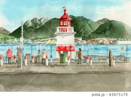 水彩で描いたバンクーバーの灯台とバードウォッチングの人々