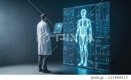 A doctor analyzing a whole-body X-ray hologram display. The concept of advanced medical diagnostics, futuristic healthcare technology, and precision in patient care. Generative AI.