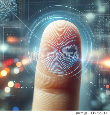 Fingerprint scanning technology on a fingertip with digital interface. Biometric identification and security concept with futuristic design