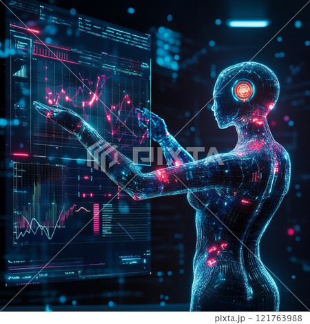 Digital assistant in the form of a holographic person displaying data and graphs in the air