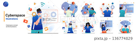 Cyberspace isolated set. Virtual reality technology, gaming and education. People collection of scenes in flat design. Vector illustration for blogging, website, mobile app, promotional materials.