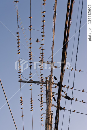 鳥害対策のない電線に群がるムクドリの大群:バードピン設置効果の比較検証用としての未対策現状記録No2