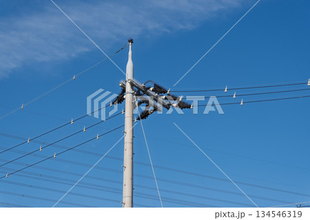 複雑に交差する電線の鳥害対策:住宅街の電柱における徹底した鳥よけ針の設置状況と地下配電線分岐