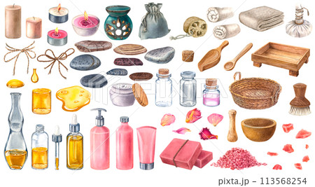 Hand drawn watercolor illustration of candles, basket, glass bottles, thai herbal ball, tray, spoon, scoop, bowl, salt, towels, loofah, aroma lamp, pouch, pebbles, rose petals on isolated background.