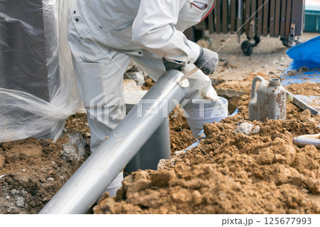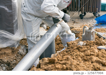 下水配管 排水管に接着剤(滑剤)をつけてる土木作業員