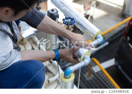 ビルの配管を点検する男性 ビルメンテナンス