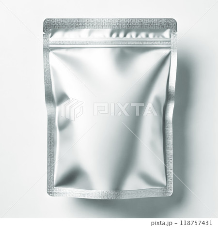 シルバーの無地パウチ袋。製品パッケージデザインに最適なモックアップ。