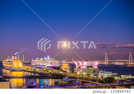 日本の横浜都市景観新景3隻コラボ。師走の満月。大さん橋の飛鳥Ⅱやパシフィック・ワ号、オーシャンフジ…
