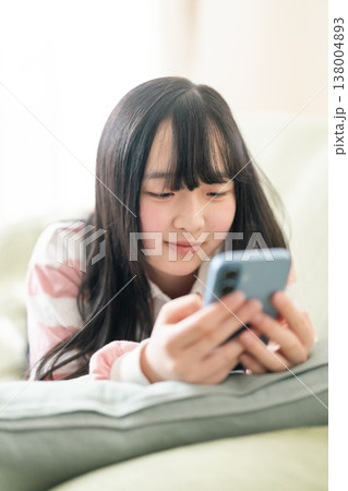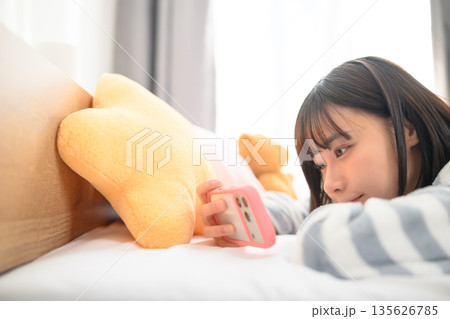 ベッドでスマホを操作する女子高生