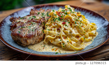 Pork Chop with Tagliatelle in Creamy Sriracha Sauce.