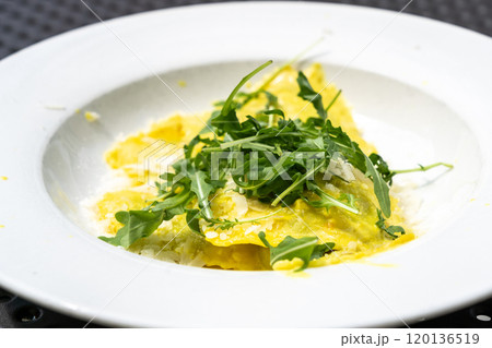 Ravioli, stuffed pasta filled with cheese, arugula topped, grated cheese, served in a lemon zest sauce