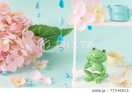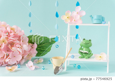 梅雨のイメージ カエルとアジサイとガーデニング用品