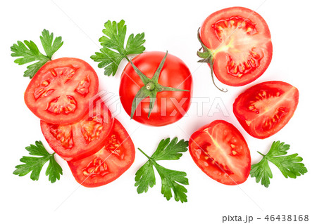 tomatoes with parsley leaves isolated on white background. Top view. Flat lay