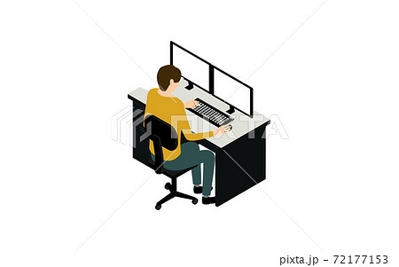 デュアルモニターでパソコン作業をする人 アイソメトリック