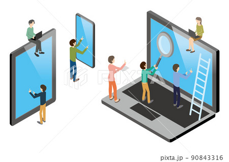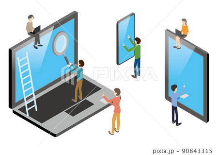 スマホやノートパソコンで情報を調べる若い男女のイラスト素材