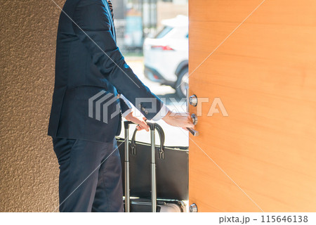 自宅の玄関を開けるスーツの男性ビジネスマン(顔なし)