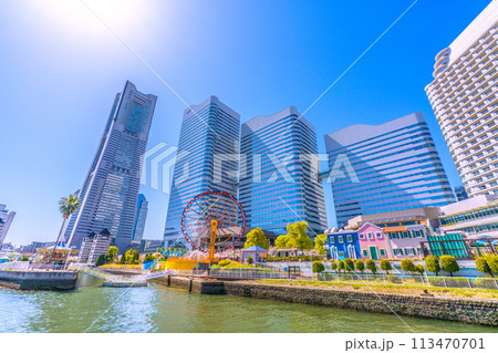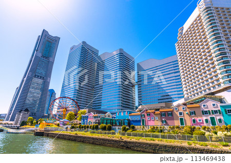 日本の横浜都市景観 スーパープラネットや横浜ランドマークタワーやクイーンズスクエアなどを望む